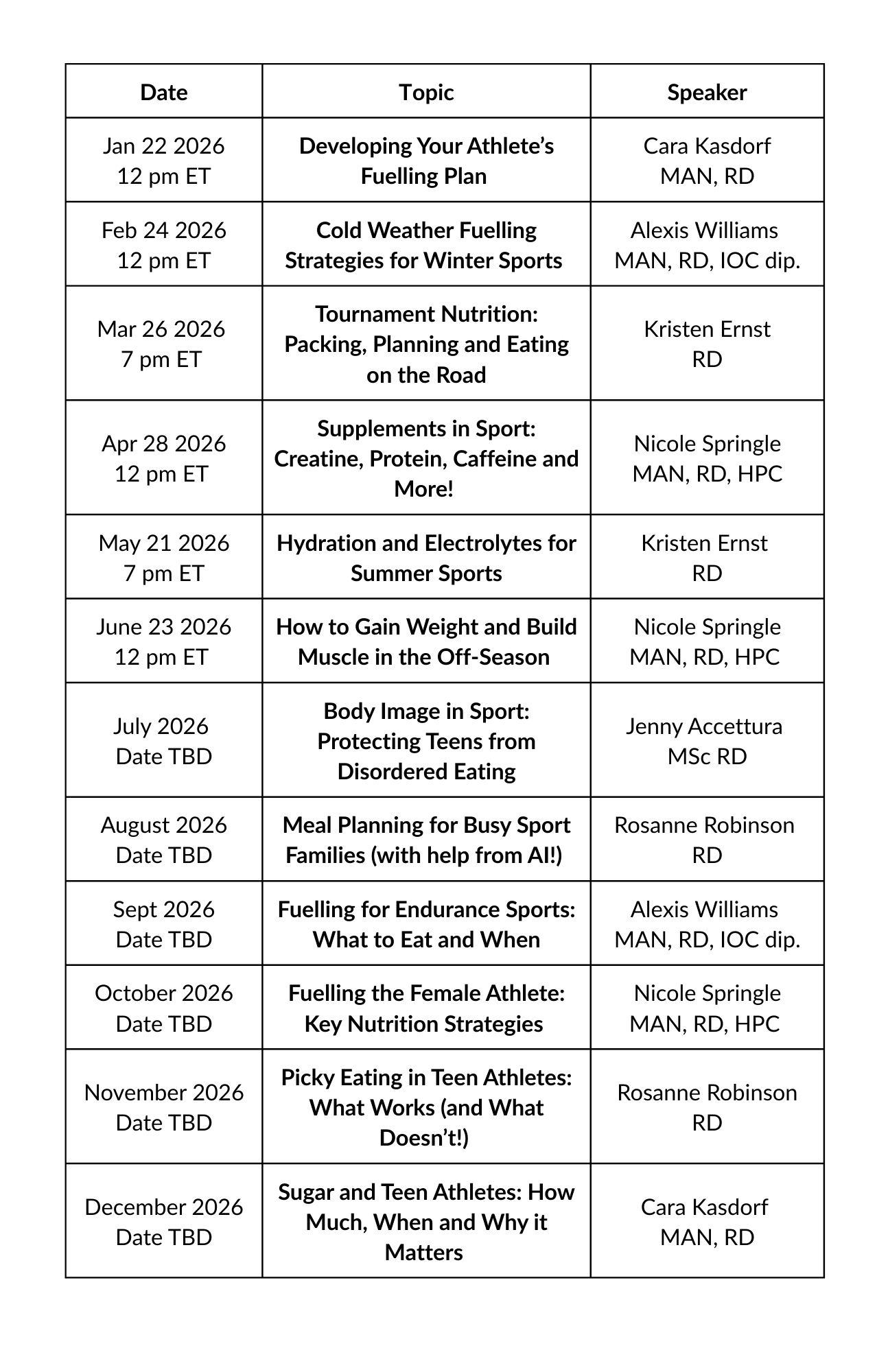Each session is practical, relatable, and backed by experienced dietitians who work with youth athletes every day.