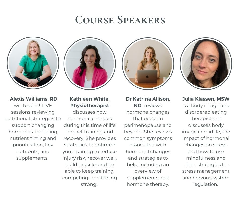 Each week combines evidence-based teaching, practical strategies, and open conversation — all designed to help you fuel and train with confidence during perimenopause.